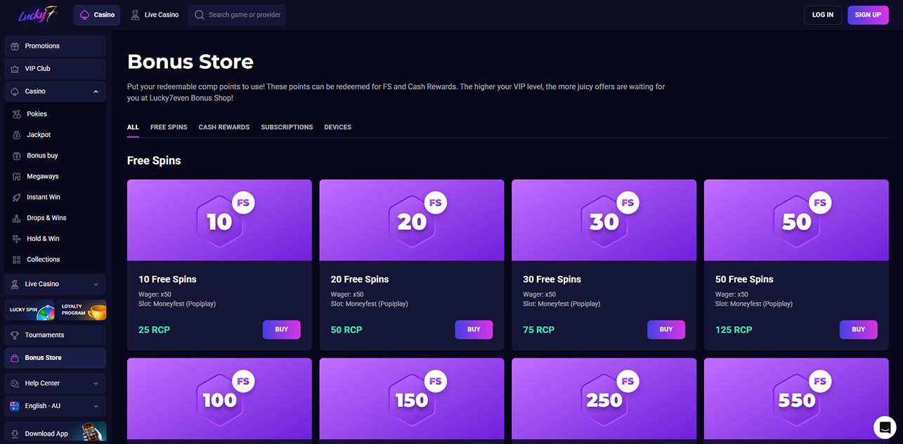 If you have made at least one deposit on Lucky7even, you can participate in the daily Lucky Spin drawing. To participate, you need to make a qualifying deposit: AU$ 50-149 assigns you the Silver category and allows you to win from 20FS to AU$ 7,500 with promo code SILVER. A deposit of AU$150 or more will qualify you for the Gold category and allow you to win from 50FS to AU$15,000 using the promo code GOLD