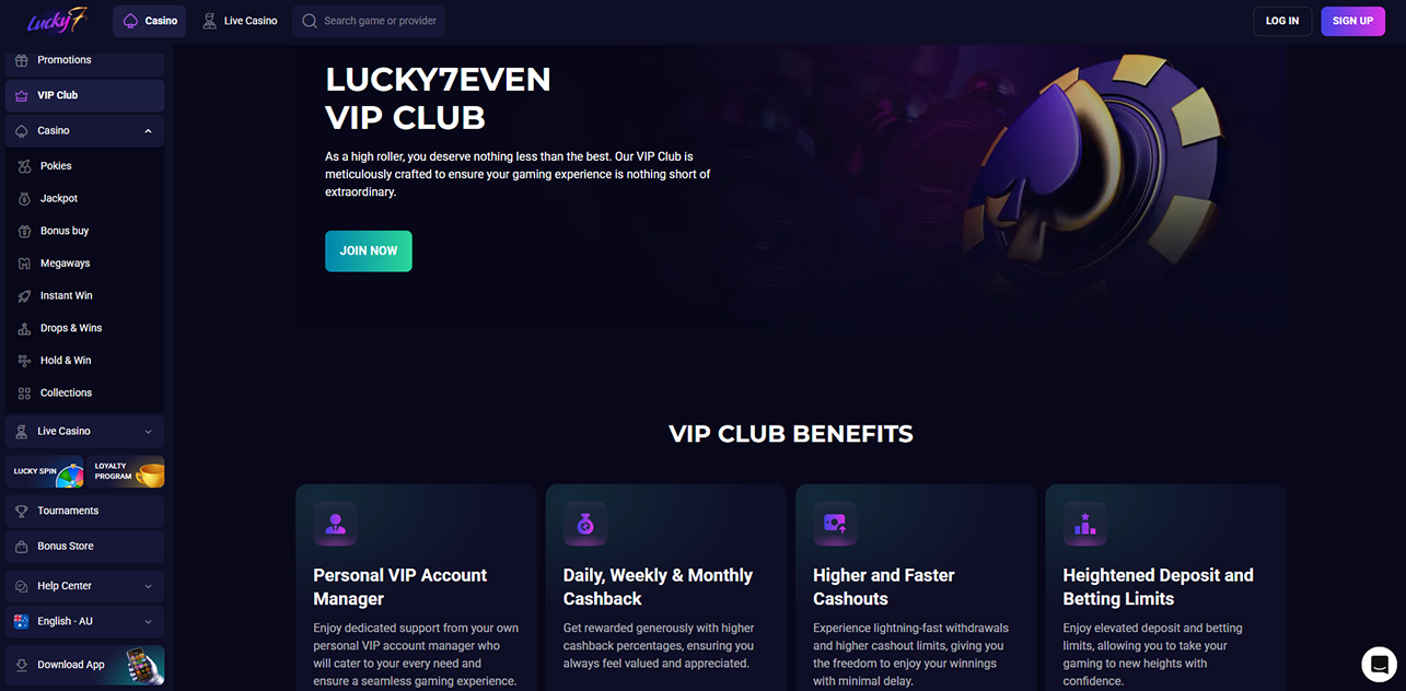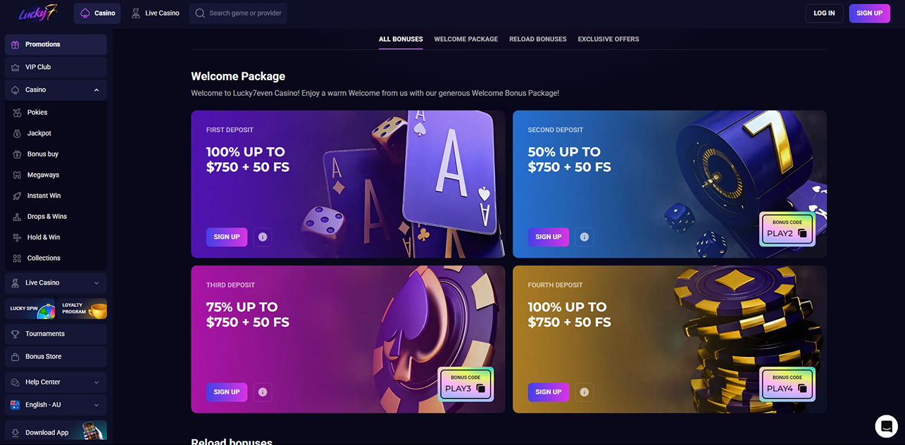 Lucky7even Casino is an exciting online casino with a cool design and easy navigation. Aussie players can enjoy over 5,000 games from top providers like Pragmatic Play, Evoplay, Fugaso, Playson, Yggdrasil, BGaming, Spribe, and more. The casino offers a bonzer welcome reward of 325% match up to AU$ 3,000 + 200 free spins for the first four deposits, along with many other attractive bonuses.