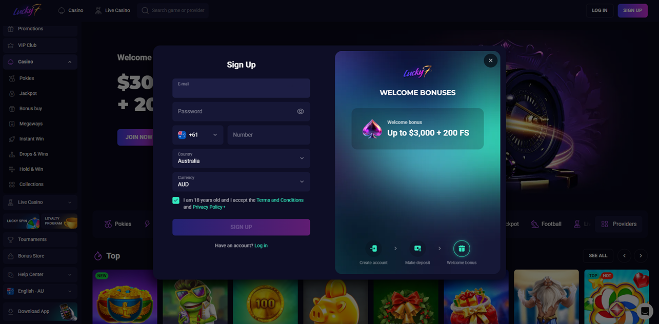 Now you have completed the registration process at Lucky7even Online Casino. You can make your first deposit, receive a welcome bonus and start playing for real AUD.