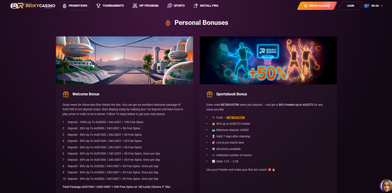 Ricky Casino invites all players from Australia to become users of their gambling website and mobile application. Right after registration, they will be able to get a welcome bonus of 3,400 AUD bonus + 200 free spins for the first ten refills and start playing with an increased bankroll for real moolah. The experts on casinoau.com have fully analyzed this brand to give their independent opinion.