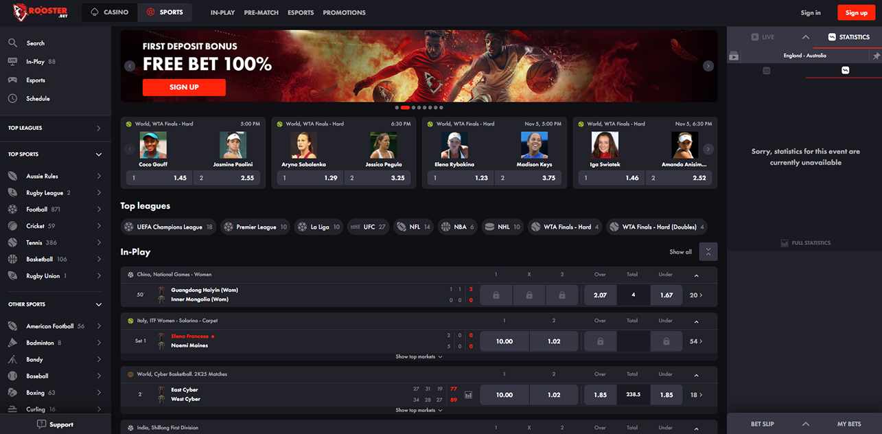 Rooster Bet is a tidy and easy-to-navigate gambling site that doesn’t mess around. The design is pleasing to the eye, with a side panel for main categories and quick links to promos, games, and support. The main colors on the site are shades of black, red, and white.